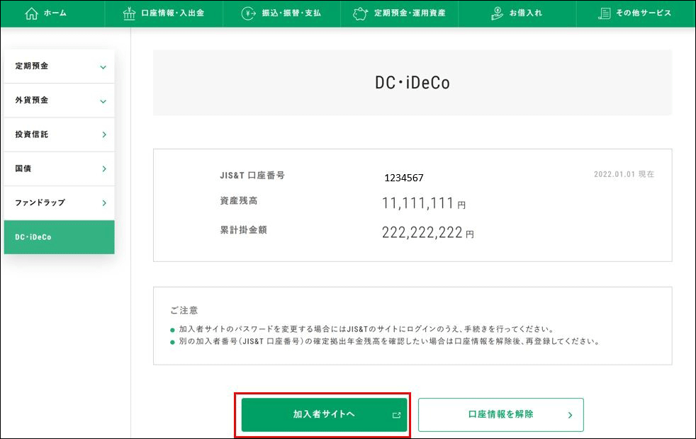 このたび、マイゲートの「定期預金・運用資産」メニュー内にある「DC・iDeCo」ボタンからDC・iDeCo加入者サイトへのシームレスログイン機能を終了させていただくこととなりました。
